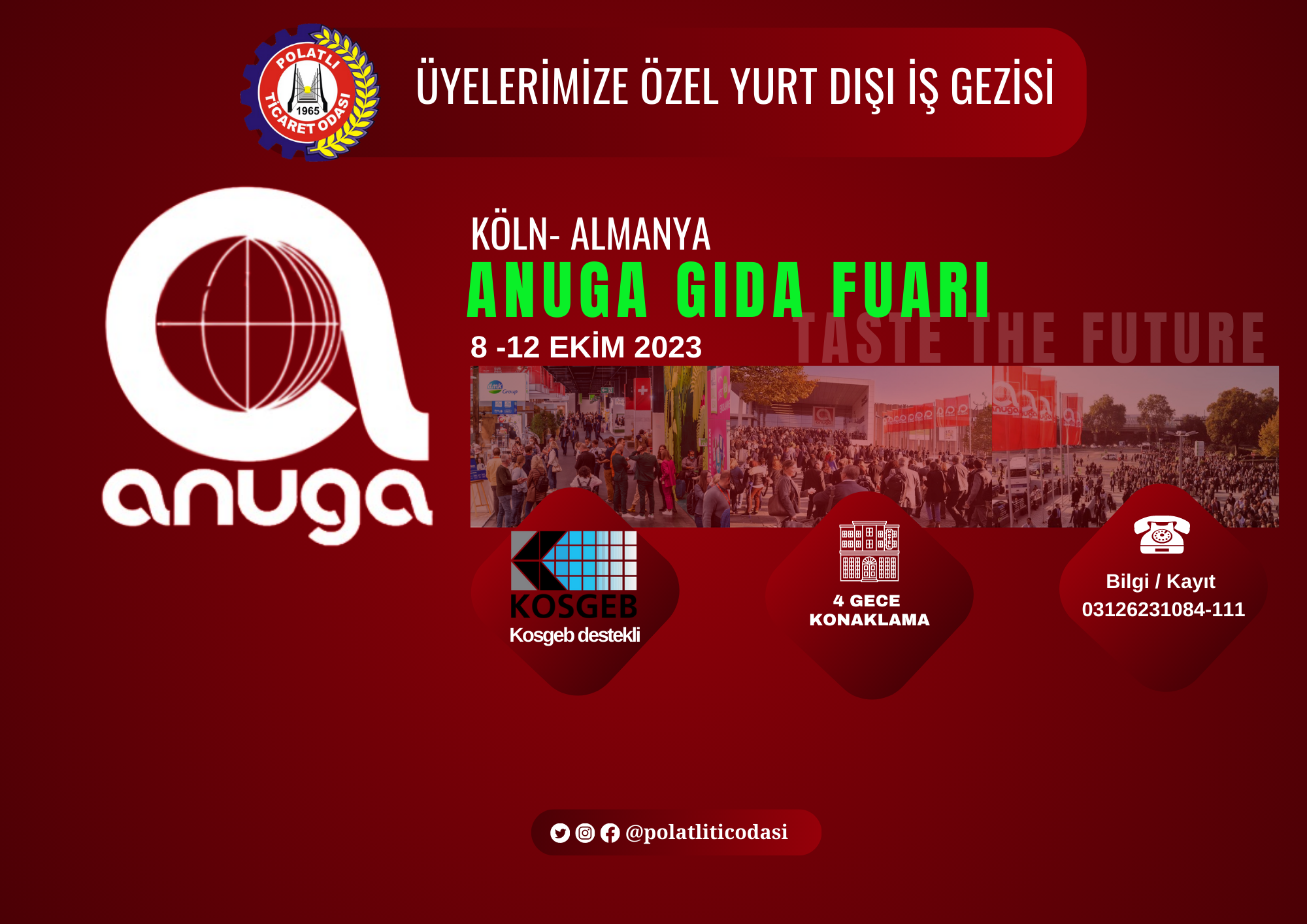08-11 Ekim tarihleri arasında düzenlenecek olan ve % 60 KOSGEB destekli düzenlenecek Dünyanın en büyük gıda fuarı olan, Almanya ANUGA Gıda fuarı yurtdışı iş gezisi için, odamız tarafından başvurular alınmaya başlandı.