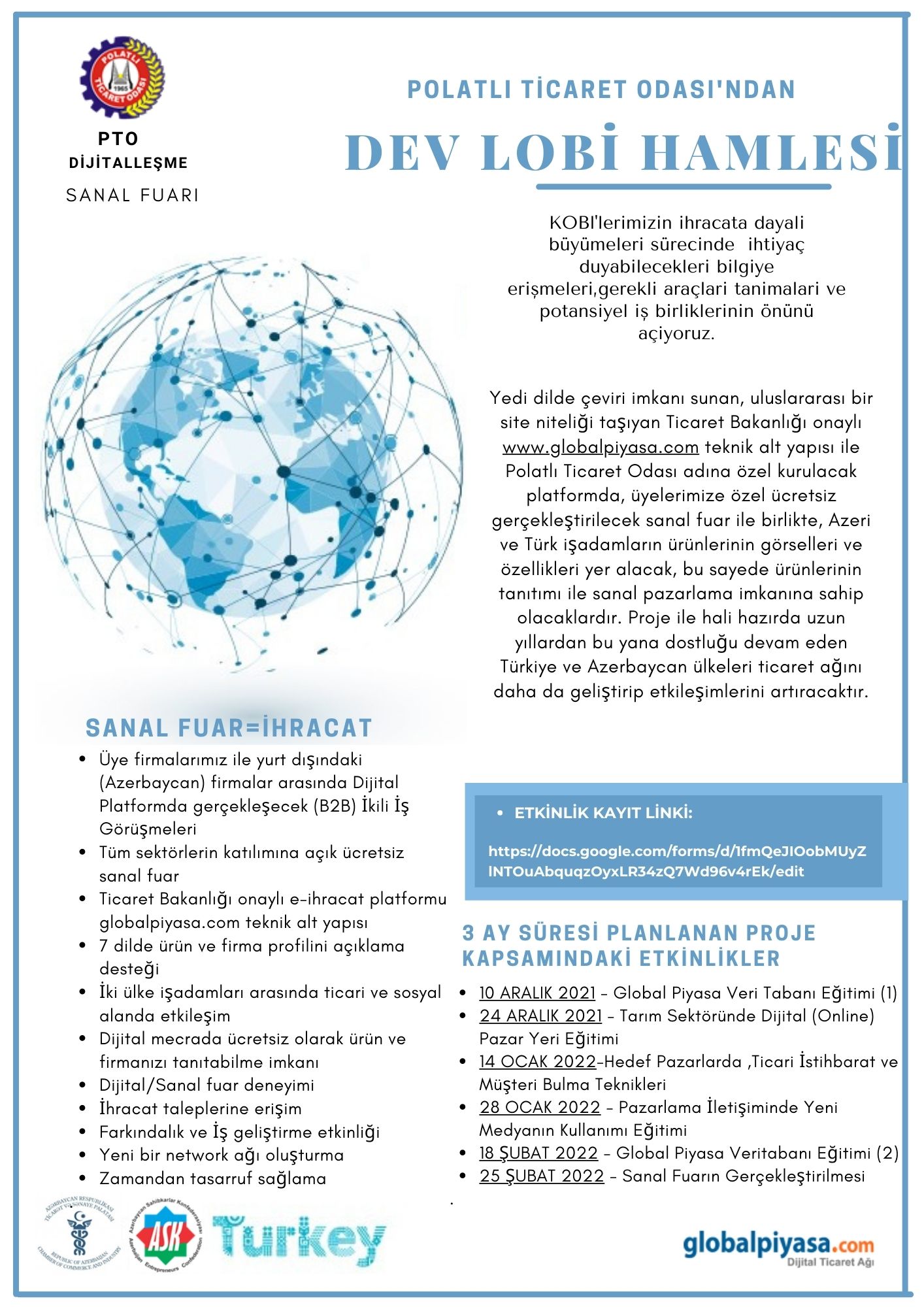 Proje kapsamında düzenlenecek olan online eğitimlere ve online tanışma toplantılarına farklı sektörlerden Ticaret Odası üyeleri ile Azerbaycan Ticaret ve Sanayi Odası üyeleri katılım sağlayacaktır. Ticaret Bakanlığı onaylı,www.globalpiyasa.com web sitesinde PTO adına özel kurulacak platformda gerçekleştirilecek fuar ile birlikte, Azeri ve Türk işadamların ürünlerinin görselleri ve özellikleri yer alacak, bu sayede ürünlerinin tanıtımı ile sanal pazarlama imkanına sahip olacaklardır. Böylece iki ülke işadamları arasında ticari ve sosyal etkileşim sağlanacaktır. Tarım Sektöründe Dijital(Online) Pazar Yeri, Hedef Pazarda Ticari İstihbarat ve Müşteri Bulma Teknikleri, Pazarlama İletişiminde Yeni Medyanın Kullanımı, Global Piyasa Veritabanı eğitimlerinin yanı sıra proje süresi içerisinde bir de profesyonel online sanal fuar düzenlenmesi planlanmaktadır. projeye dahil olmak isteyen firmalar ilgili link üzerinden kayıt yaptırabilir. https://docs.google.com/forms/d/1fmQeJIOobMUyZlNTOuAbquqzOyxLR34zQ7Wd96v4rEk/edit