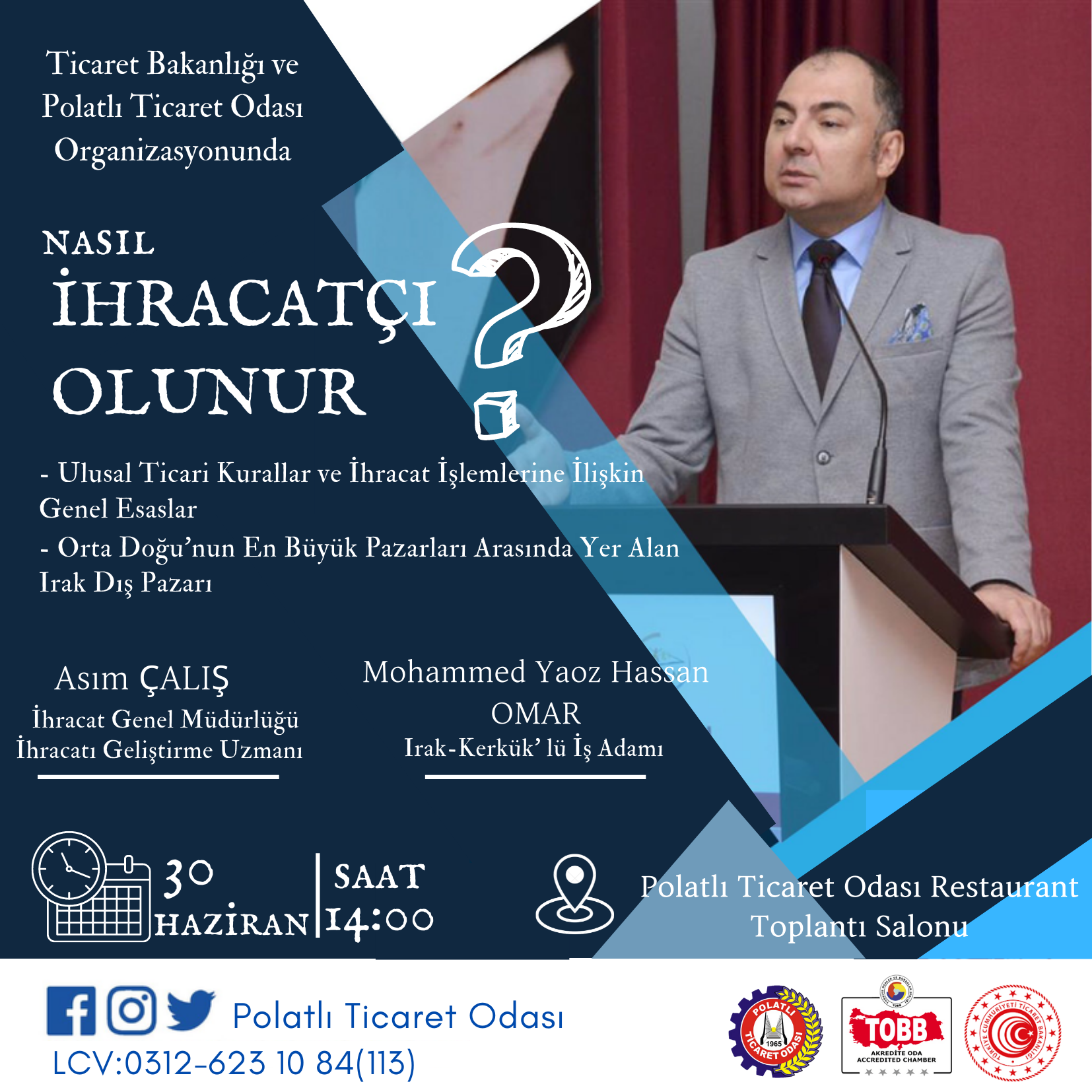 Polatlı Ticaret Odası Ek binasında (Şehit Cüneyt Sertel Sosyal Tesisleri) 30 Haziran Perşembe günü saat 14:00 da düzenlenecek eğitimde" Nasıl İhracatçı Olunur?" konusu ele alınacak. Ticaret Bakanlığı- İhracat Genel Müdürlüğü Uzmanı Asım Çalış ve Irak-Kerkük'lü iş adamı, Mohammed Yaoz Hassan Omar eğitime konuşmacı olarak katılacak. Ticaret Odası üyelerine özel organize edilecek programda ulusal ticari kurallar ve ihracat işlemlerine ilişkin genel esaslar, Orta Doğu'nun en büyük pazarları arasında yer alan Irak Dış Pazarı konuları ele alınacak. Eğitime kayıt olmak veya eğitim hakkında detaylı bilgi almak isteyen Ticaret Odası üyeleri 03126231084-113'ü arayabilir.