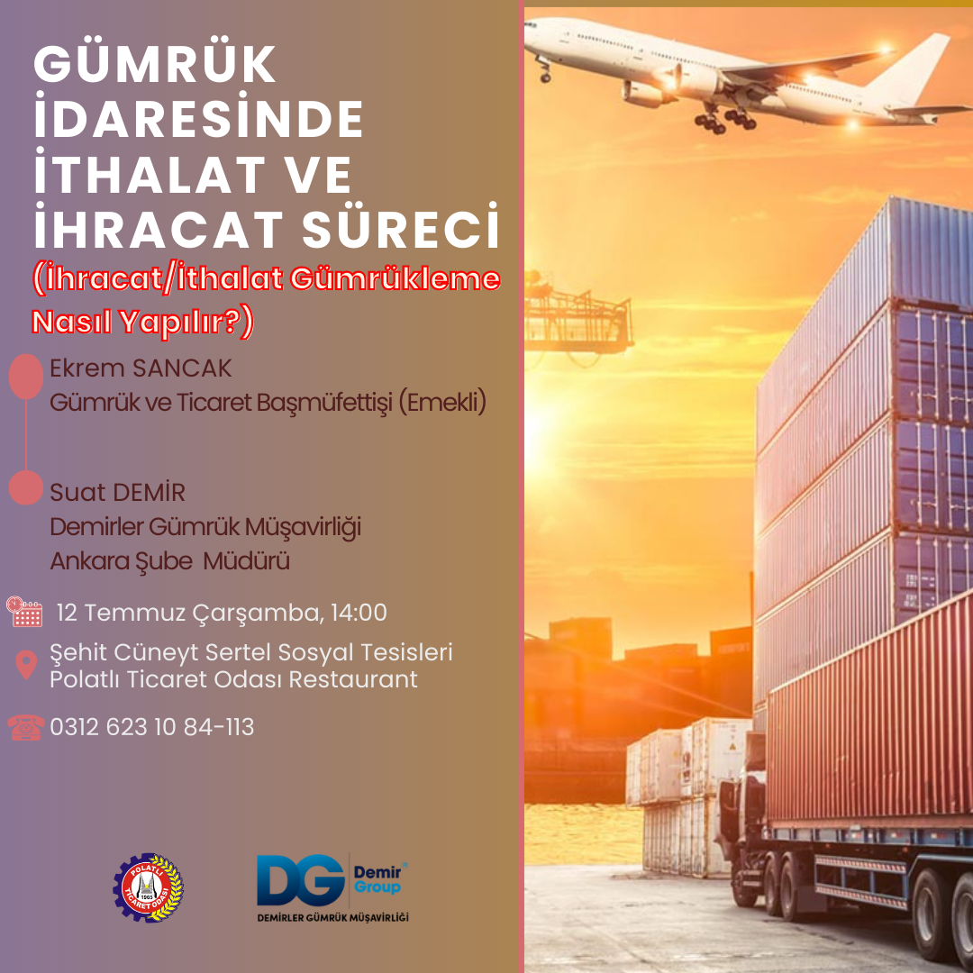 Polatlı Ticaret Odası üyelerinin ticari hayatında yol almalarını kolaylaştırmak, değişen ve gelişen düzenlemeler hakkında bilgi sahibi olabilmeleri amacı ile düzenlediği toplantılarını aralıksız sürdürüyor. Bu kapsamda ihracat ve ithalatta gümrükleme metodları Gümrük İdaresinde İthalat ve İhracat Süreci Bilgilendirme Toplantısında ele alınacak. 12 Temmuz Çarşamba saat 14:00 da Ticaret Odası Restaurant’ta düzenlenecek bilgilendirme toplantısı tüm üyelerin katılımına açık olacak. Gümrük ve Ticaret Başmüfettişi (Emekli) Ekrem Sancak, Demirler Gümrük Müşavirliği Ankara Şube Müdürü Suat Demir’in konuşmacı olarak yer alacağı toplantıya kayıtlar 03126231084- 113’ten yaptırılabilecek.