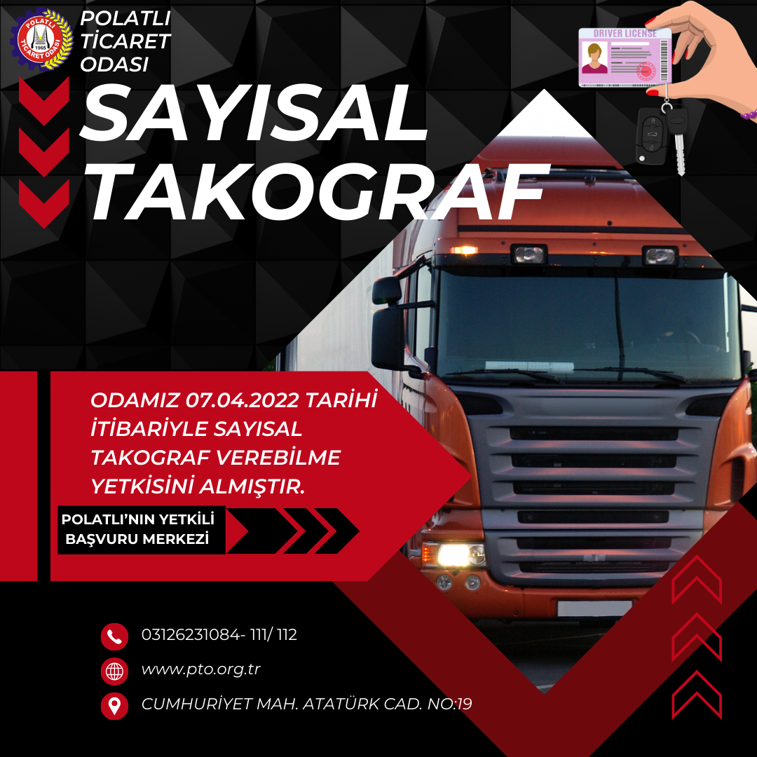 Odamız 2022 yılı Nisan ayı itibarıyla dijital ehliyet/ sayısal takograf başvuru ve teslim alma merkezi olmuştur. Önceki yıllarda il merkezlerinden teslim alınan sayısal takograf kartları artık POLATLI TİCARET ODASI’ ndan temin edilebiliyor. Zaman ve maliyet açısından büyük kolaylık sağlayan bu hizmet sayesinden kart almak isteyen adaylar sadece başvuru ücreti ödeyerek kartlarını kolay bir şekilde teslim alıyor. Özellikle nakliye sektörü başta olmak üzere karayolu taşımacılıkta kullanılması zorunlu olan sayısal takograf kartı 2 yıl içerisinde 1300 kişiye teslim edilmiştir.