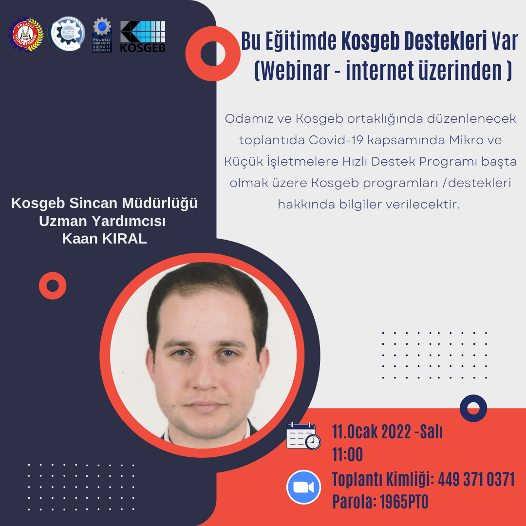 Polatlı Ticaret Odası, Polatlı Ticaret Odası Organize Sanayi Bölgesi, Polatlı Organize Sanayi Bölgesi üyeleri başta olmak üzere desteklerden bilgi sahibi olmak isteyen herkesin katılımına açık olacak Kosgeb bilgilendirme webinarında Kosgeb 'in açıkladığı Covid-19 kapsamında Mikro ve Küçük İşletmelere Hızlı Destek Programı başta olmak üzere Kosgeb programları /destekleri hakkında bilgiler verilecek, katılımcıların soruları yanıtlanacak. 11 Ocak 2022 Salı günü saat 11:00'de zoom meeting programı üzerinden gerçekleştirilecek bilgilendirme toplantısında mevcut desteklerin detayları aktarılacak. Toplantı bilgileri şu şekildedir. https://us02web.zoom.us/j/ 4493710371?pwd= S3MvVEJ0aS9DdnlOUzhTOVNXOTl3UT 09